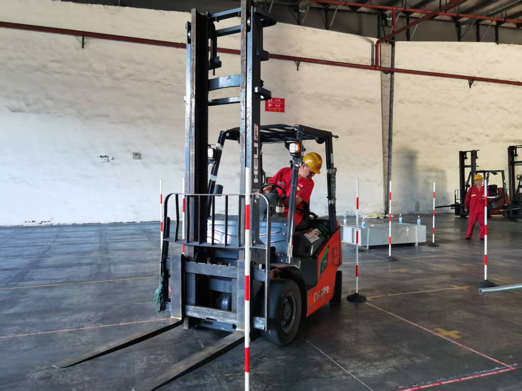 实践操作考核则是本次大赛的 “重头戏”,现场围满观赛员工,气氛热烈又紧张。三个实操项目各有侧重:“起伏越障碍” 要求选手驾驶满载货物的叉车,在行驶中精准控制货叉升降,平稳越过 3 道高低不一的障碍杆,稍有不慎就会碰杆,十分考验对车辆平衡的把控与操纵杆的微操能力;“绕桩” 项目中,10 根桩杆呈直角排列,形成仅容叉车通过的狭窄通道,选手需以最快速度穿梭其间,既要追求速度,又要避免碰擦桩杆,对转向角度和行驶轨迹的预判能力提出极高要求;“穿挂螺丝” 更是难度升级,选手需操控叉车,利用货叉尖焊接的细铁针,穿过托盘上螺丝的细小螺孔,再将螺丝平稳挂到上方的细钢筋上,铁针与螺孔直径相近,稍有晃动便会失败,现场观众屏息凝神,每当有选手成功穿挂,都会爆发出阵阵喝彩。参赛选手们沉着冷静,凭借娴熟技艺完成各项挑战,精准的操作赢得现场掌声不断。