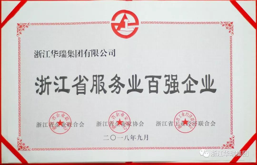 2018年9月11日,浙江省企业联合会、浙江省企业家协会、浙江省工业经济联合会连续第十六次发布“浙江省百强企业”、“浙江省制造业百强企业”、“浙江省服务业百强企业”榜单及报告,浙江华瑞集团有限公司荣登《2018浙江省服务业百强企业》榜单。 这是浙江华瑞集团连续第12年荣获“浙江省服务业百强企业”称号,再次彰显出华瑞多年来稳健发展的实力。浙江华瑞集团将继续把握服务本质,坚持转型升级,积极推进创新